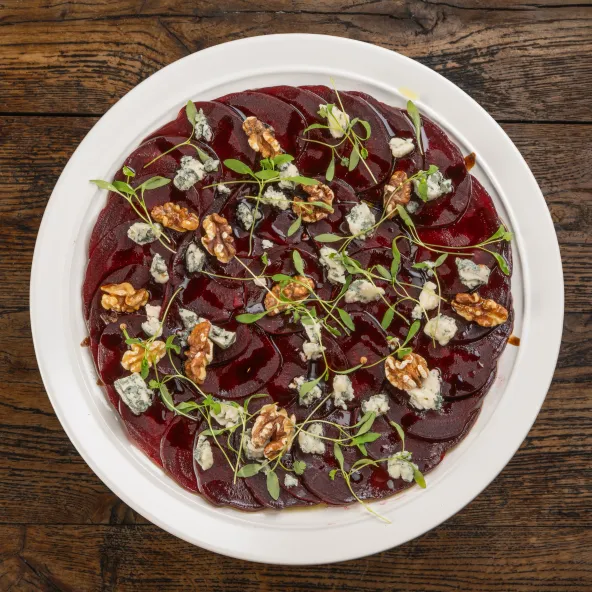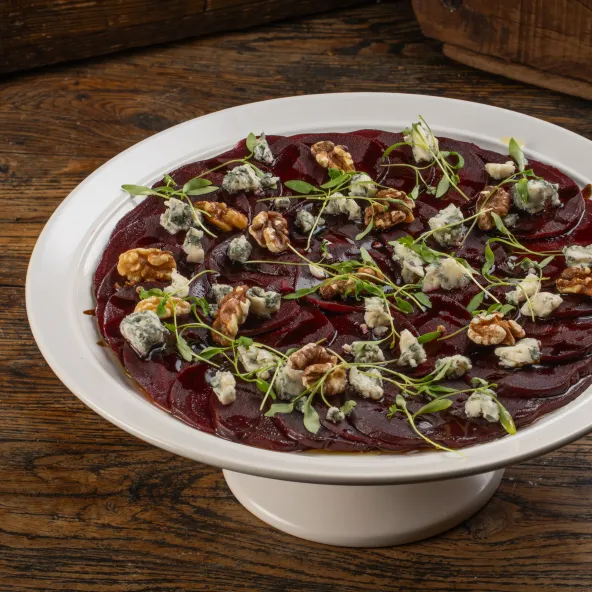 פרוסות סלק דקות בתיבול עדין למנה צבעונית ומרעננת.