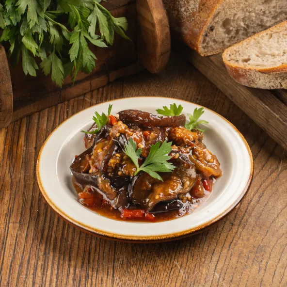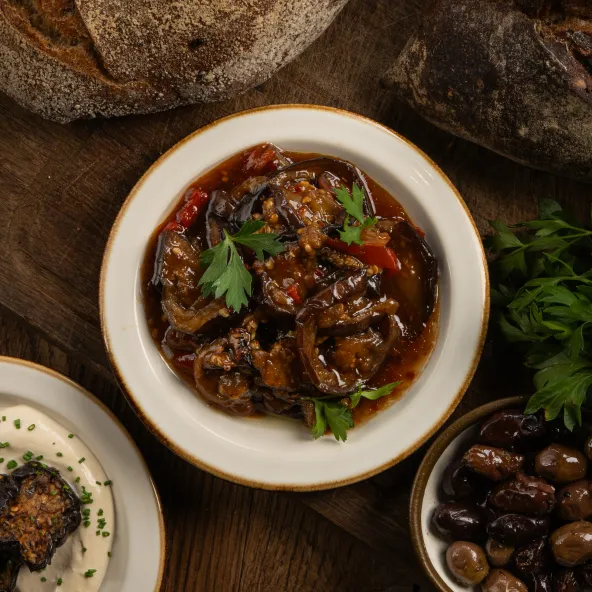 חצילים קלויים ומתובלים בעדינות לסלט עשיר בטעמים ים תיכוניים.