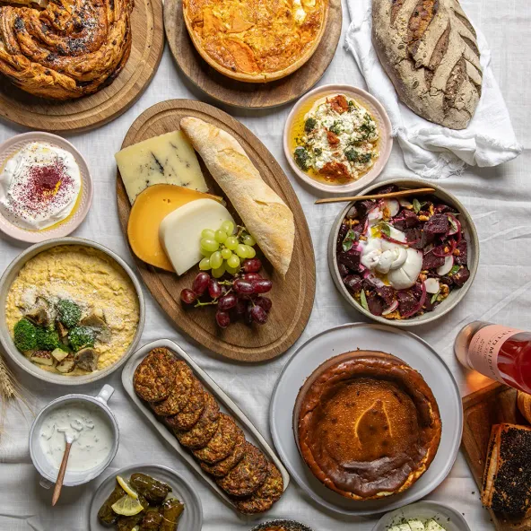 ארוחת חג חגיגית המתאימה ל8 סועדים- 12 שושני שמרים מנצגו ועגבניות, קיש בטטה, סלקים ובוראטה, לחם אגוזים, 8 לביבות זוקיני, צזיקי, עלי גפן ממולאים באורז, לאבנה סומק, בולגרית ים תיכונית, סקורדליה, קוביות בולגרית בפסטו, 3 חריצי גבינה, עוגת גבינה באסקית, בקבוק יין מדבר רוזה.