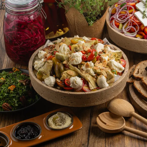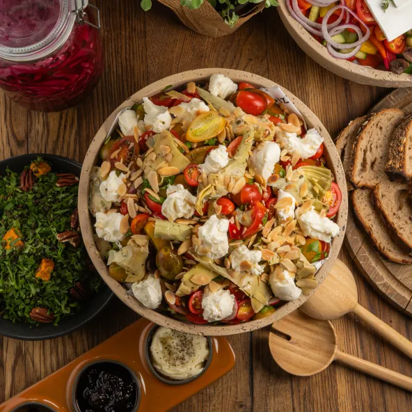 שילוב צבעוני של עגבניות שרי, ארטישוק, שקדים פרוסים קלויים ומוצרלה רכה, סלט עשיר ורענן שמביא את טעמי השוק לצלחת.